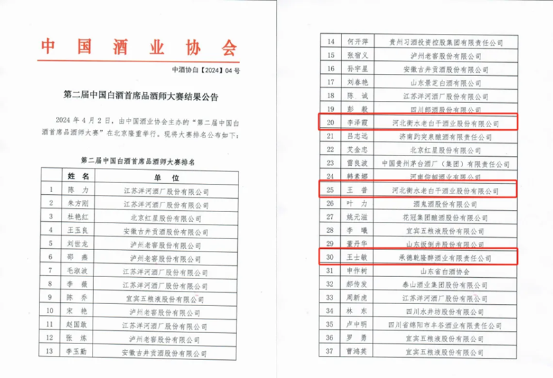 2024年4月2日,由中國酒業協會主辦的“第二屆中國白酒首席品酒師大賽”在北京隆重舉行。衡水老白干在原有李澤霞一位中國白酒首席品酒師的基礎上,又添王普、王士敏兩位中國白酒首席品酒師。