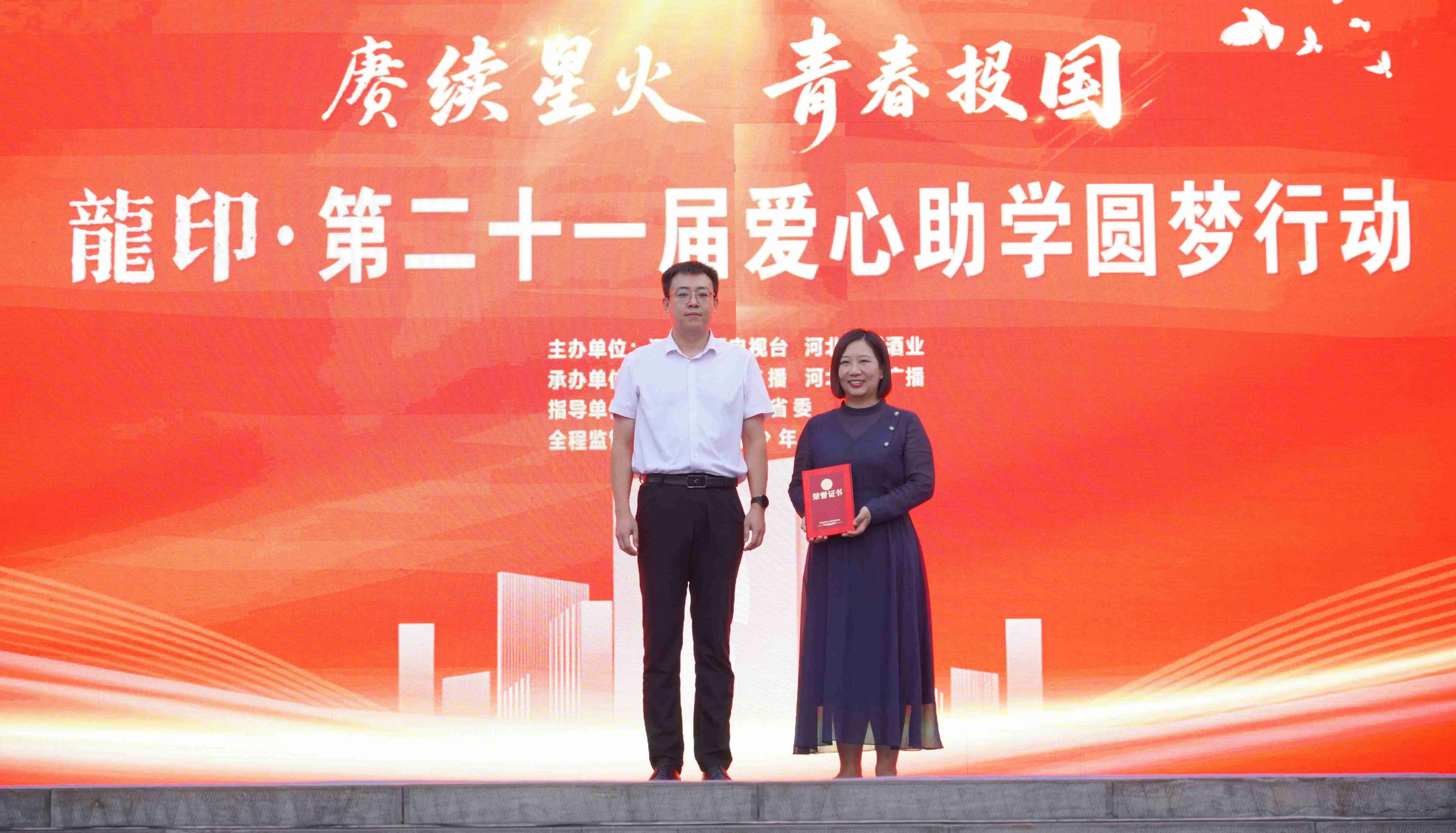 河北廣播電視臺(tái)副總編輯邊宇峰、板城酒業(yè)銷售市場(chǎng)總監(jiān)王曉波登臺(tái)為學(xué)子頒發(fā)助學(xué)金。